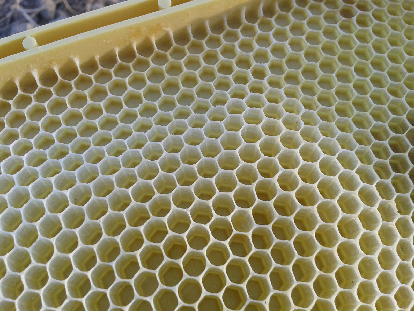 El único inconveniente es que estos panales de plastico MannLake tienen las celdillas un poco más grandes de lo que necesitamos, 4,97mm y que será un poco más difícil para las abejas de estirar luego la cera estampada de 4.9mm.